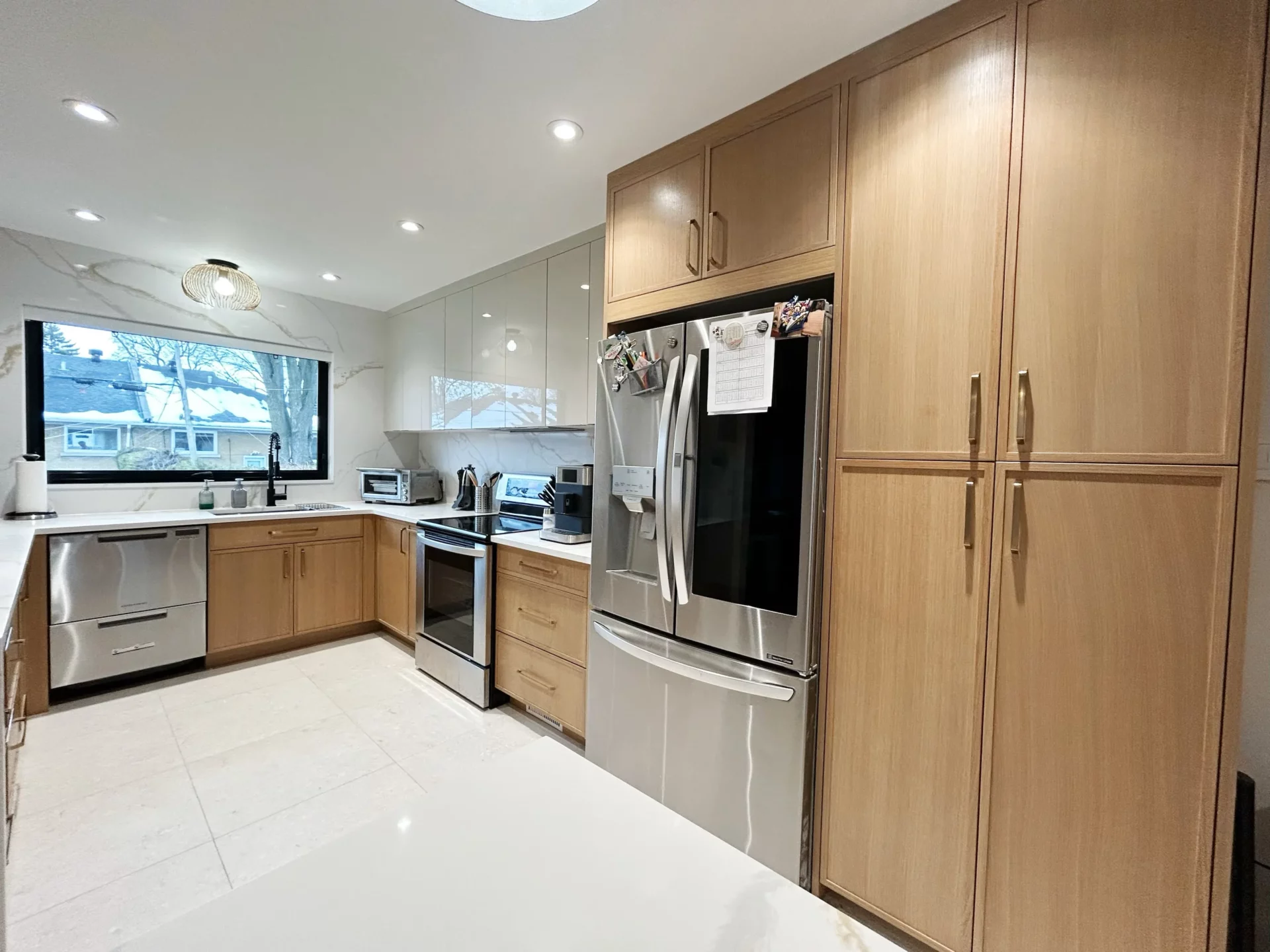 Sable Slim Shaker updates the classic five-piece door with ultra-narrow stiles and rails, letting the real-wood veneer take center stage. A light, neutral tone and fine, straight grain add organic texture without visual weight. Choose vertical or horizontal grain on doors and panels to emphasize height or width, and mix with slab drawers for a streamlined run. The result is a fresh, modern interpretation of Shaker that remains warm, durable, and easy to pair.