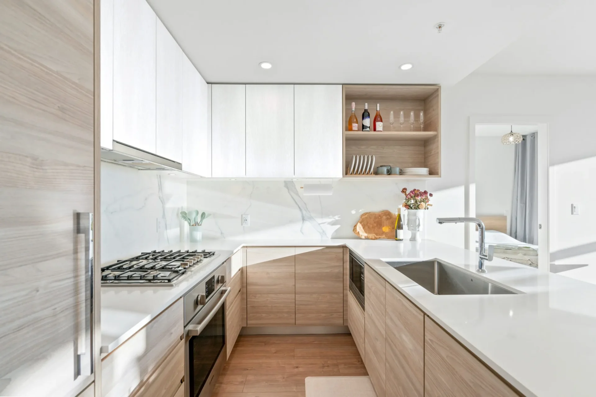 - ¾” adjustable shelves edge-banded in wood veneer natural finish