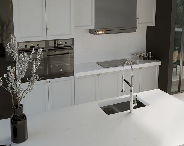 Vicostone Misterio entangles brown and gray vein layers spreading over a luxurious white marble-look background. One of our most popular designs for its elegance and natural aesthetic.